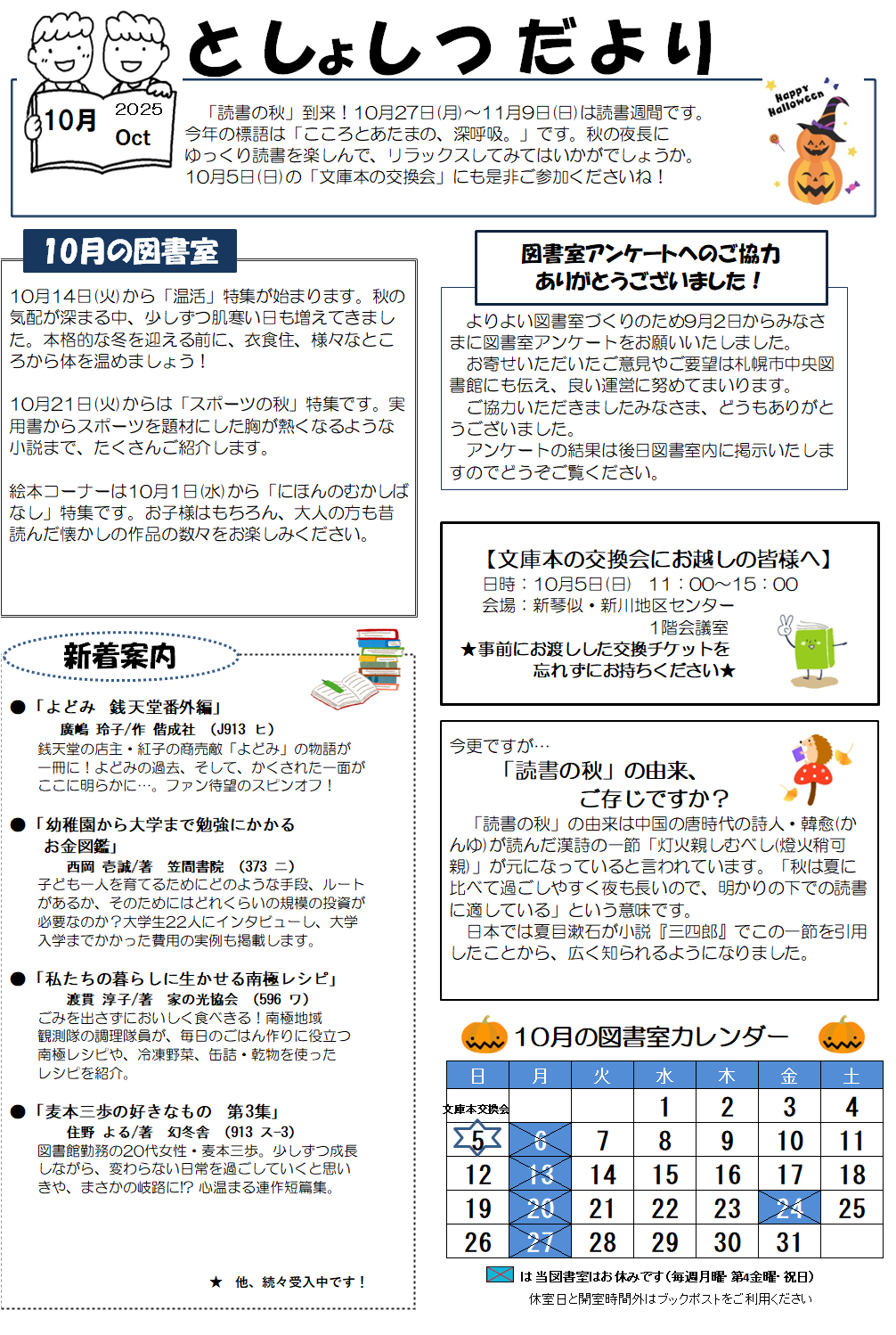 月曜日・図書整理日(通常第4金曜日)・祝日・蔵書一斉点検期間は休室日です。